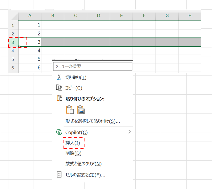 マウスを右クリックしてメニューより「挿入」を選択します。