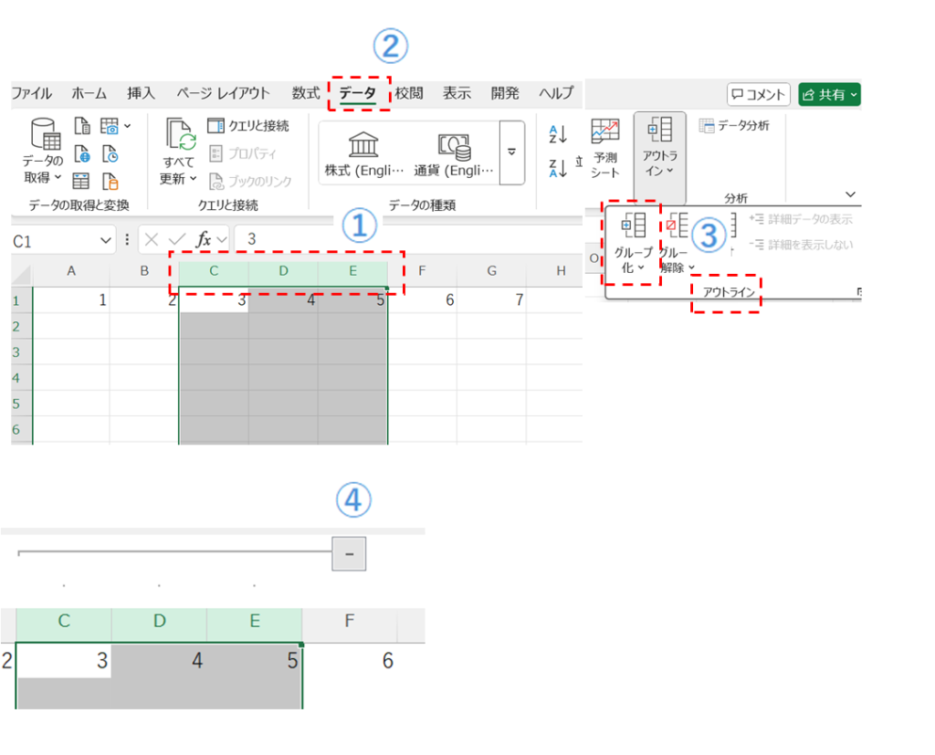 ④グループ化が完了すると、選択した列の上部に以下のようなアウトライン記号が表示されます。- (マイナス記号): グループを展開して表示している状態です。この記号をクリックすると、グループ化された列が非表示になります。+ (プラス記号): グループが折りたたまれて非表示になっている状態です。この記号をクリックすると、グループ化された列が再表示されます。