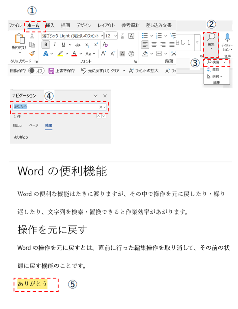 ②編集のリボンをクリックして、メニューの③検索をくっりっくする