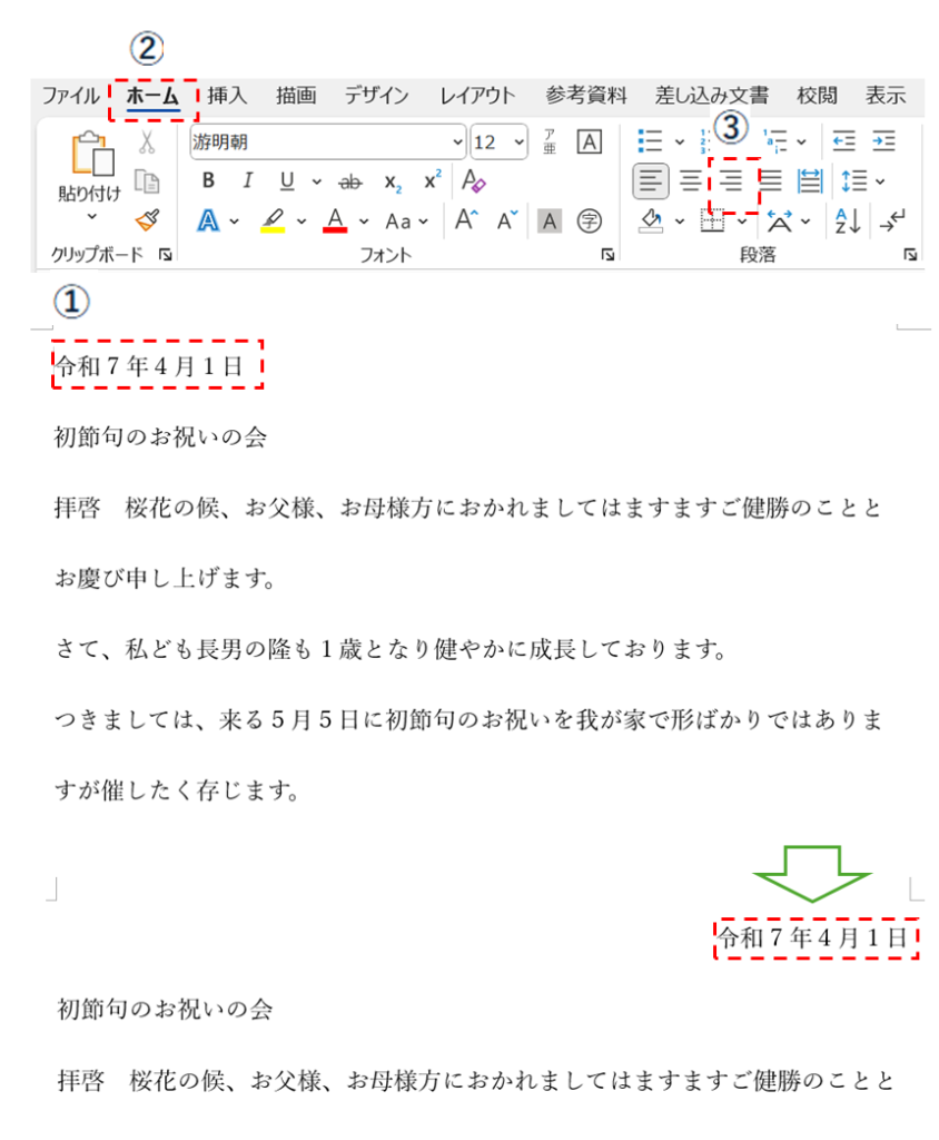 ビジネス文書の標準といえる段落として、日付は右揃えが基本となります。