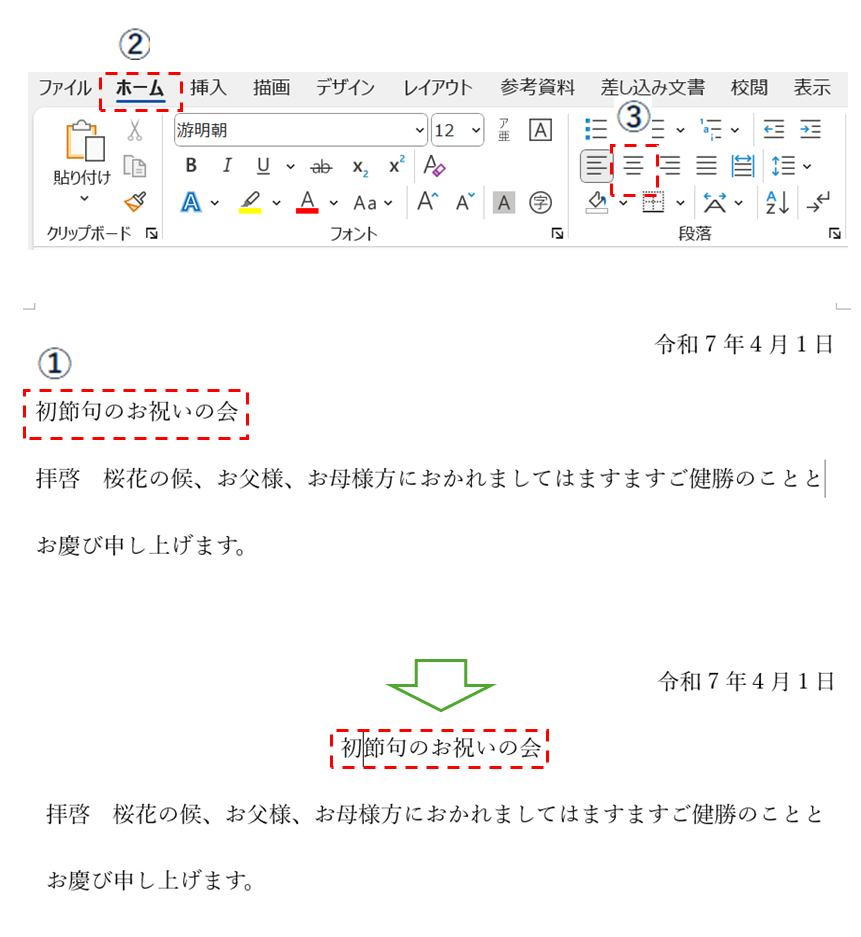 ③段落の中央揃えをクリックする