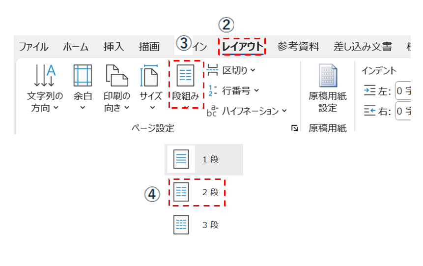 ③段組みを選択して、④2段を指定する