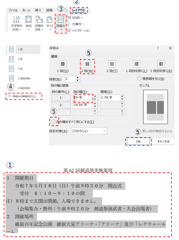 ②レイアウトタブより、③段組みをクリックして、メニューの④段組みの詳細設定をクリックする
