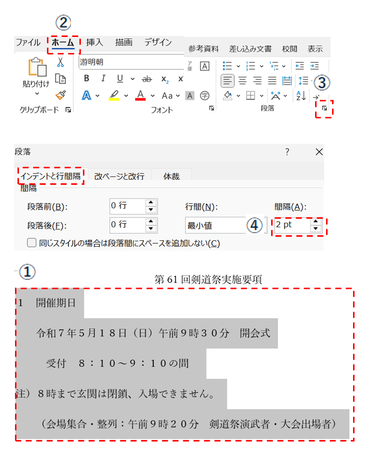 段落のメニューから行間を最小値・間隔ポイント数を変更する