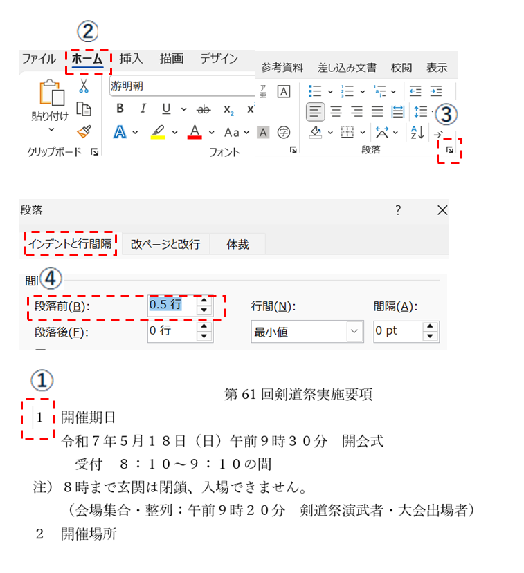 ②ホームタブをクリックし、の段落グループにある③「↓」のブルダウンメニューに表示される