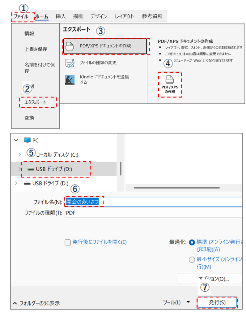 ④ 「PDF/XPSの作成」をクリックする