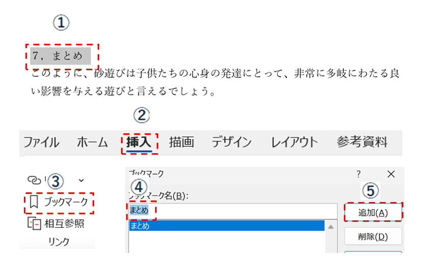 ブックマークは、文書内の特定の場所に名前を付けて目印をつけ、後からその場所に素早く移動できるようにする機能です。