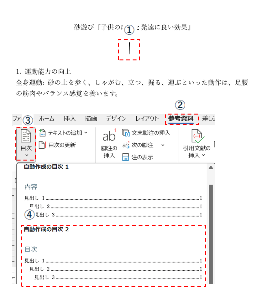 ① 目次の挿入位置を選択