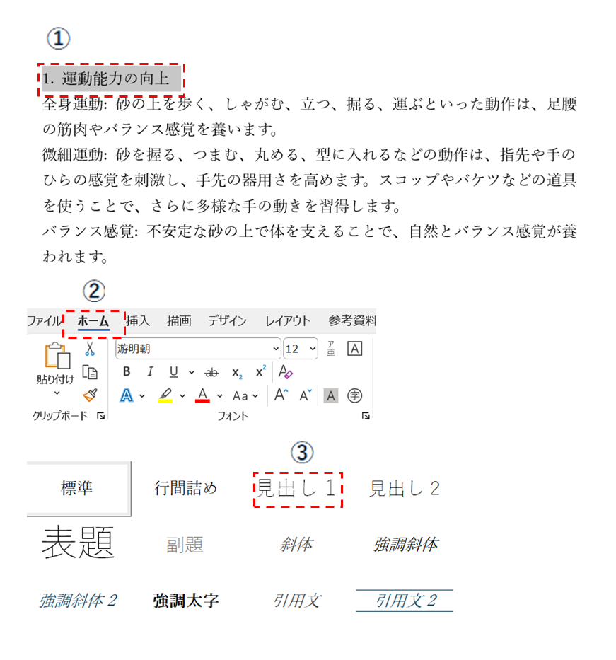 ③「見出し1」をクリックする