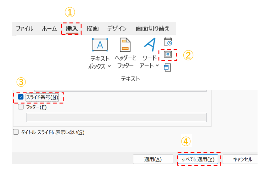 ③ 「スライド番号」にチェックします