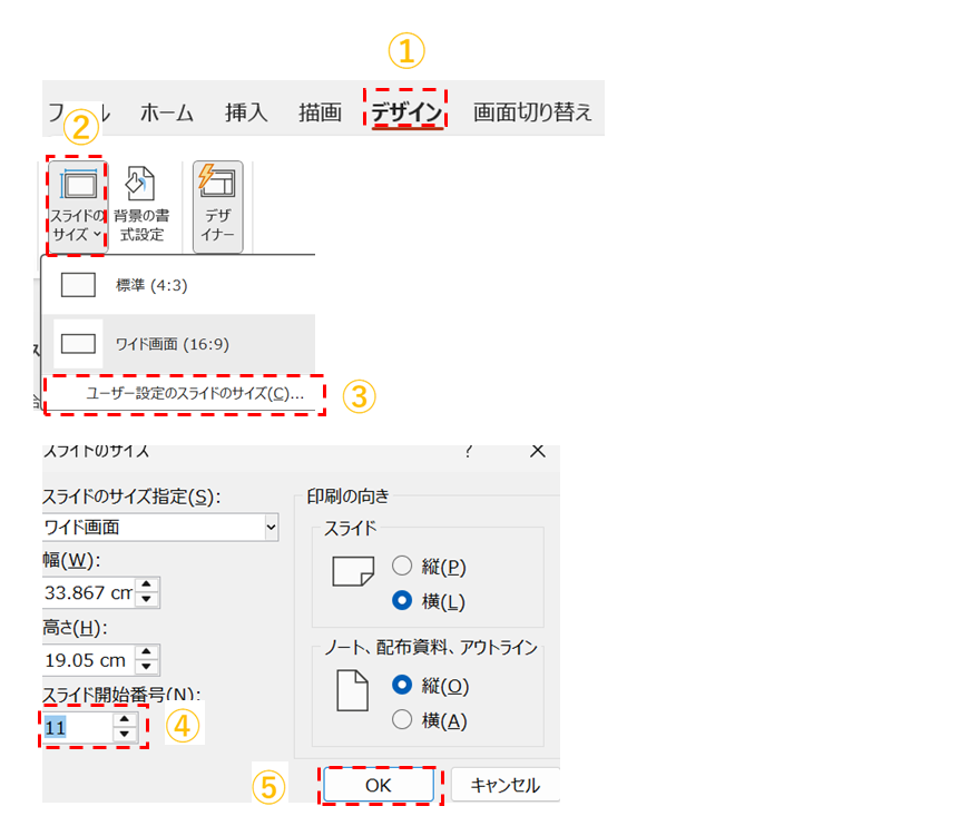 ④ スライドの開始番号を11」にします