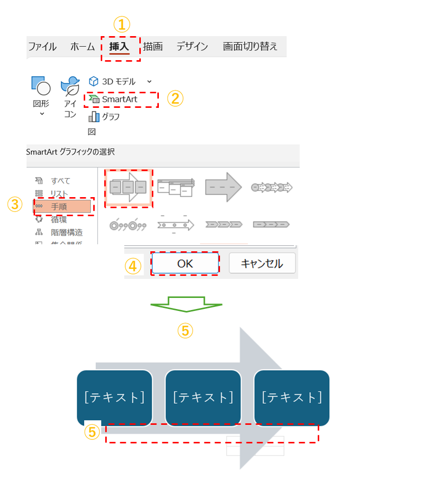 ③SmartArtの種類を選択し、④「OK」をクリックします