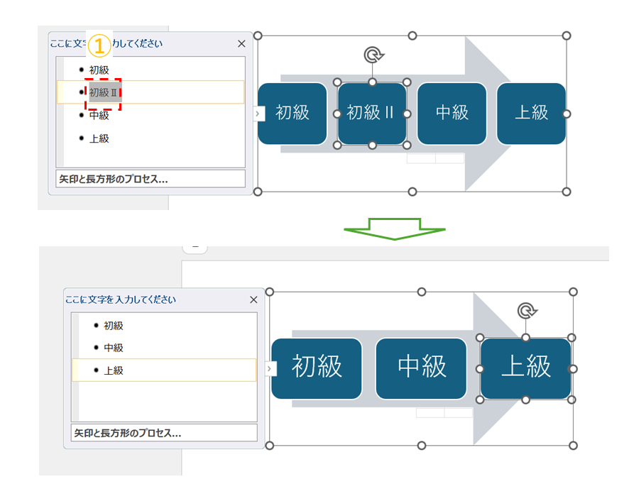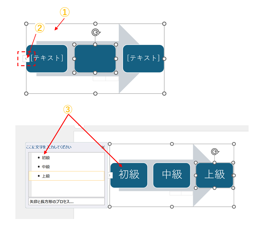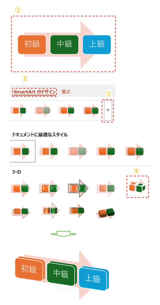 ③「SmartArtのスタイル」のボタン「v」をクリックします。