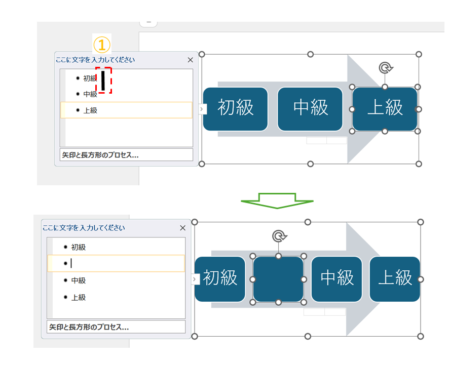 ①追加したい図形見出しの末尾にカーソルを合わせ、「Enter」キーを押します