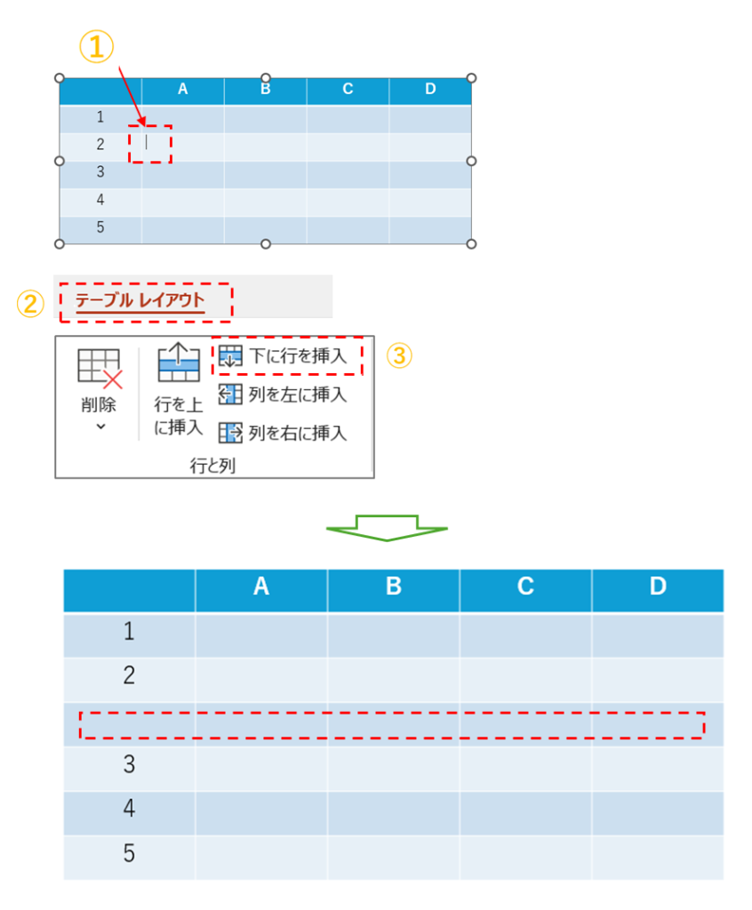 ③「行と列」グループの「下に行を挿入」をクリックします