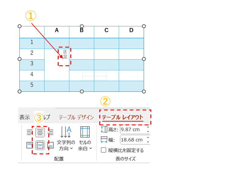 ③「配置」グループの「左右中央揃え」、「上下中央揃え」をクリックします