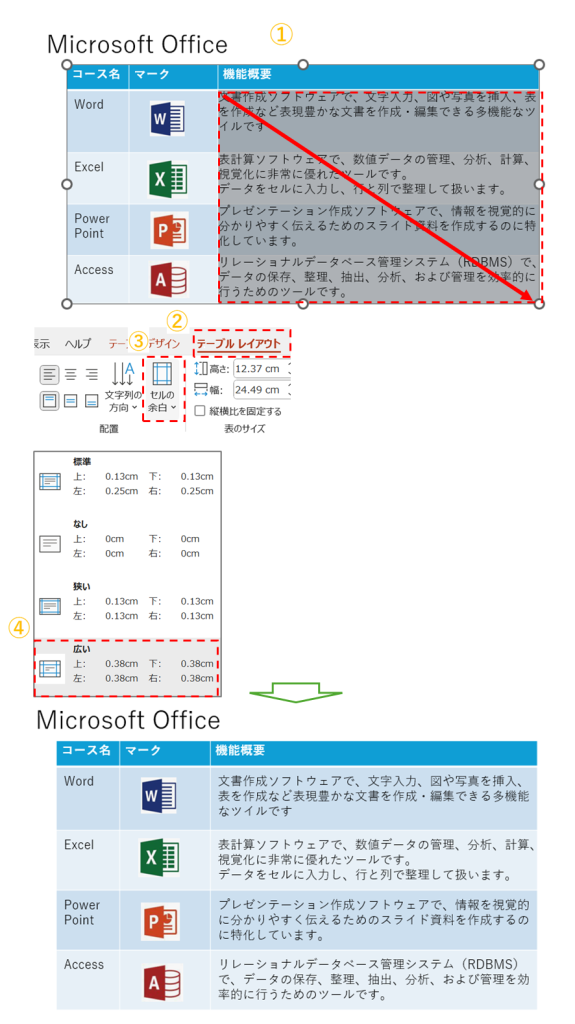 ①間隔を変更するセル全体を選択します
