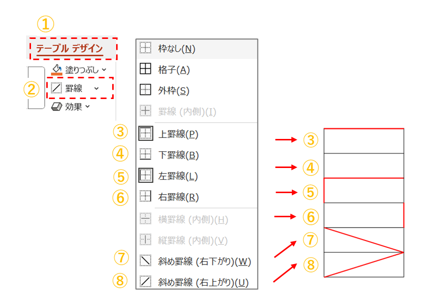 ⑥罫線の種類を選択します